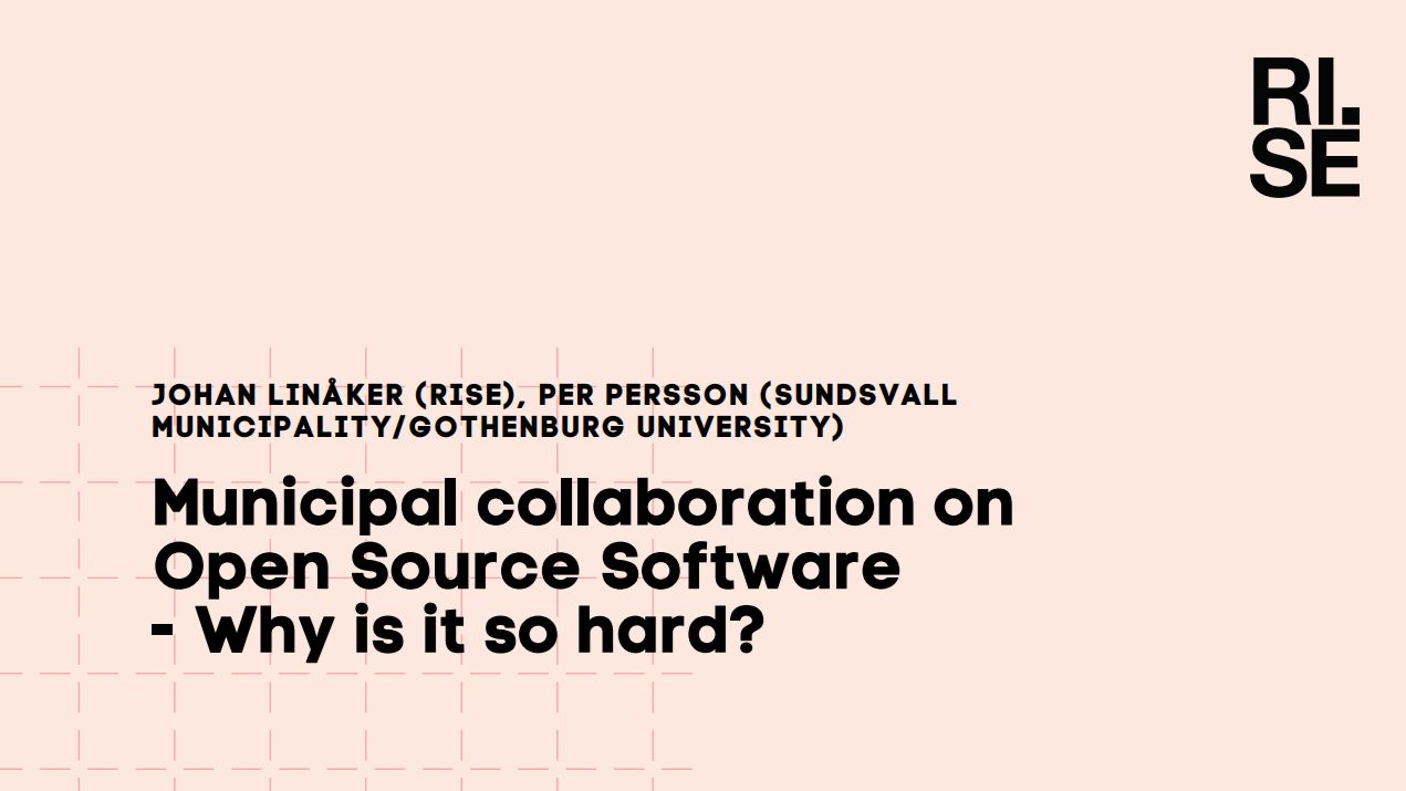 Kommuner delar många typer av uppgifter och har en enormt stor potential att tjäna på (åter)användning, delning och samverkan kring öppen programvara (öppen källkod eller eng. Open Source Software). Samtidigt är utmaningarna många. Några exempel inkluderar: bristande intern förmåga, kapacitet och kultur, osäkerheter kring hur öppen programvara kan beaktas och utvärderas, luckor och missuppfattningar kring ex. legala och säkerhetsrelaterade aspekter, avsaknad av koordinering, samt process för långsiktig förvaltning.